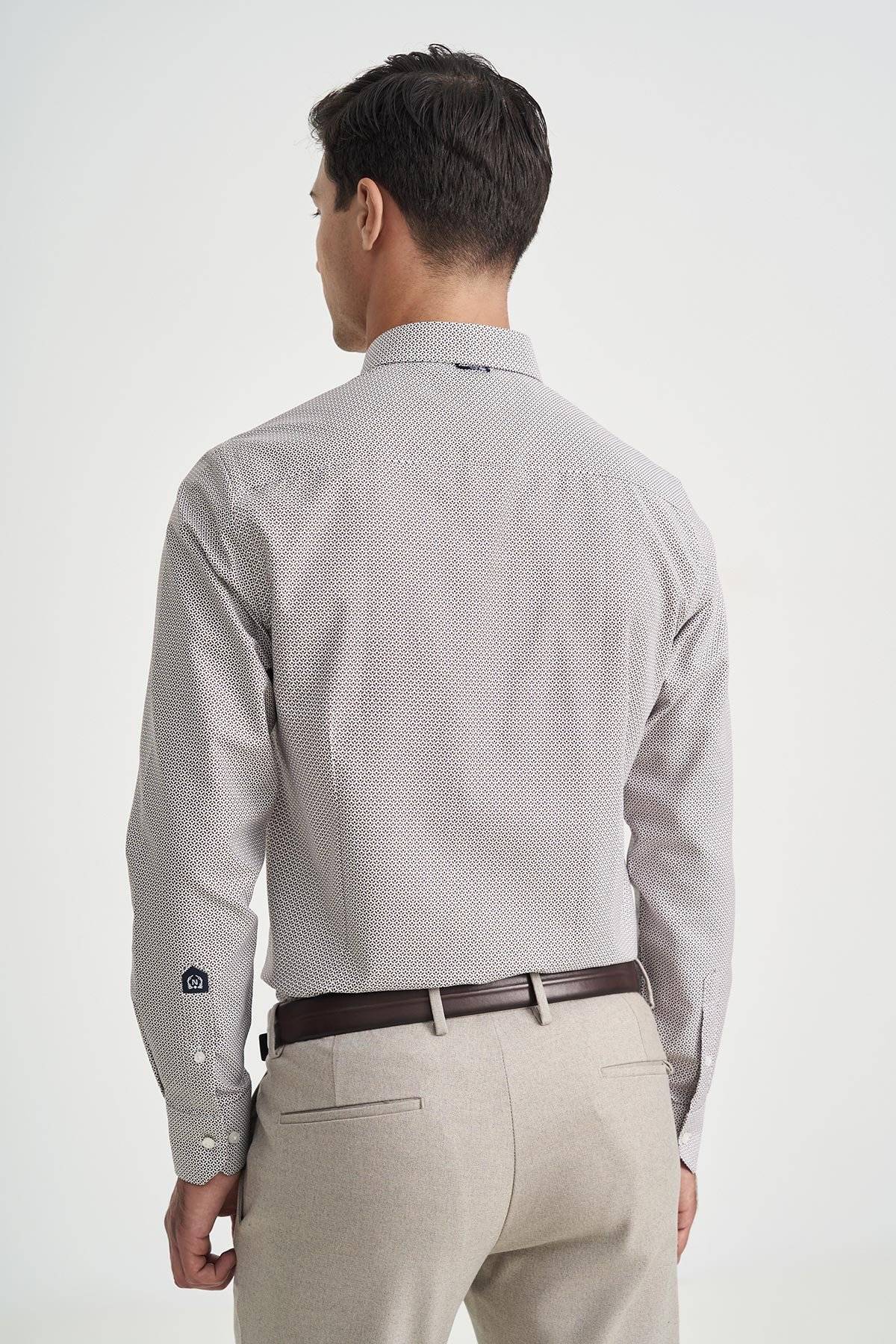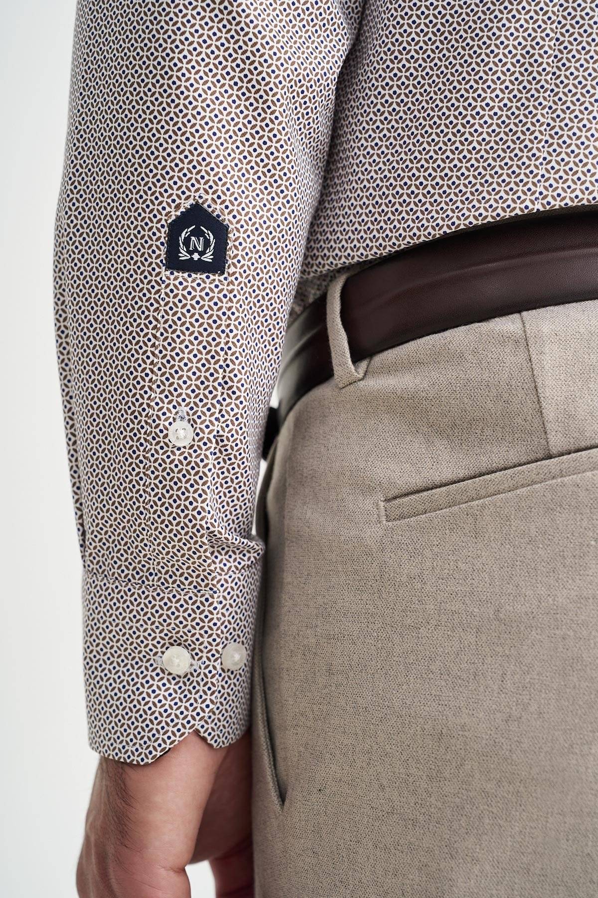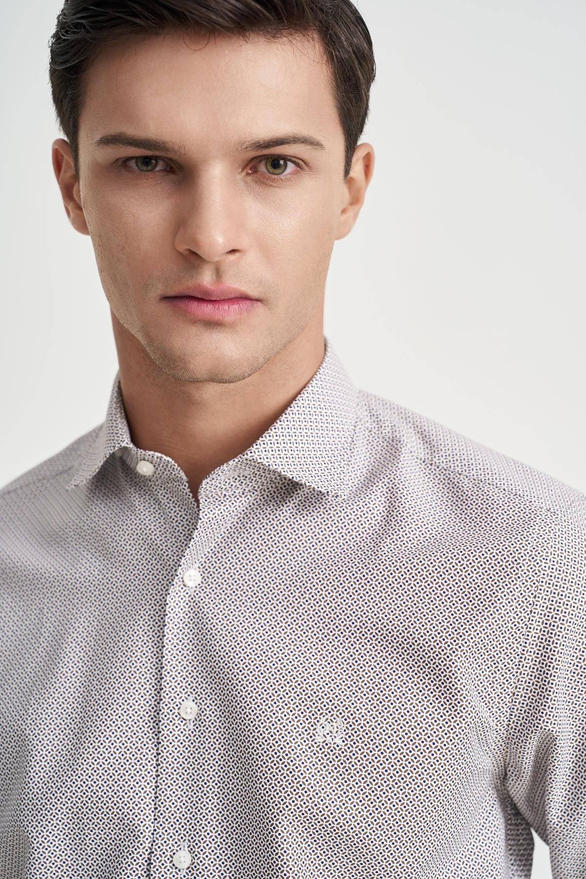 Men's all over printed white shirt with brown and blue details, from Monte Napoleone. Under the collar there are buttons to hold it in place when worn without a tie. It has the company's monogram embroidered on the right chest. Excellent quality, perfect fit and special design details, in an easy-to-wear shirt, which you can comfortably combine with chinos, jackets and other pieces from our collection, ideal for business chic, casual chic and smart casual looks.