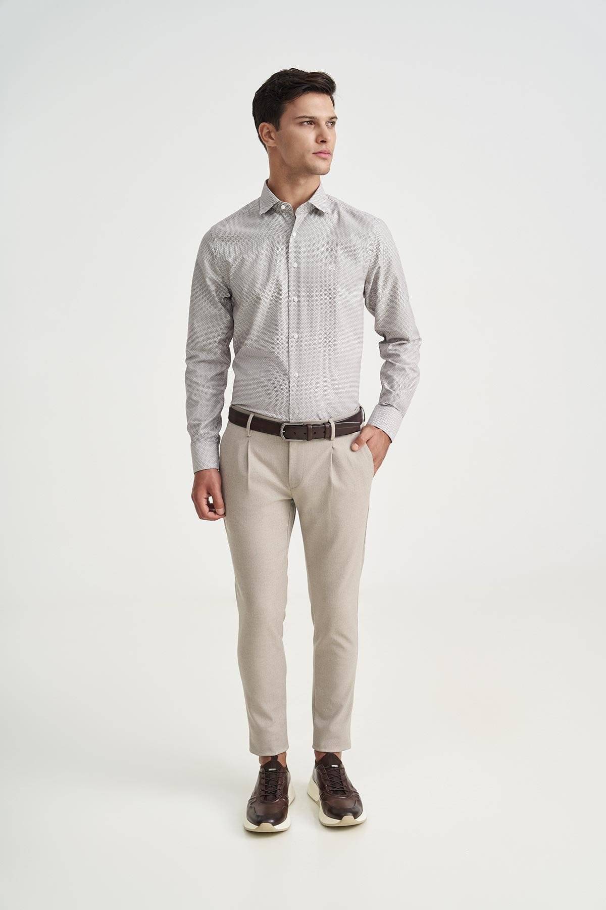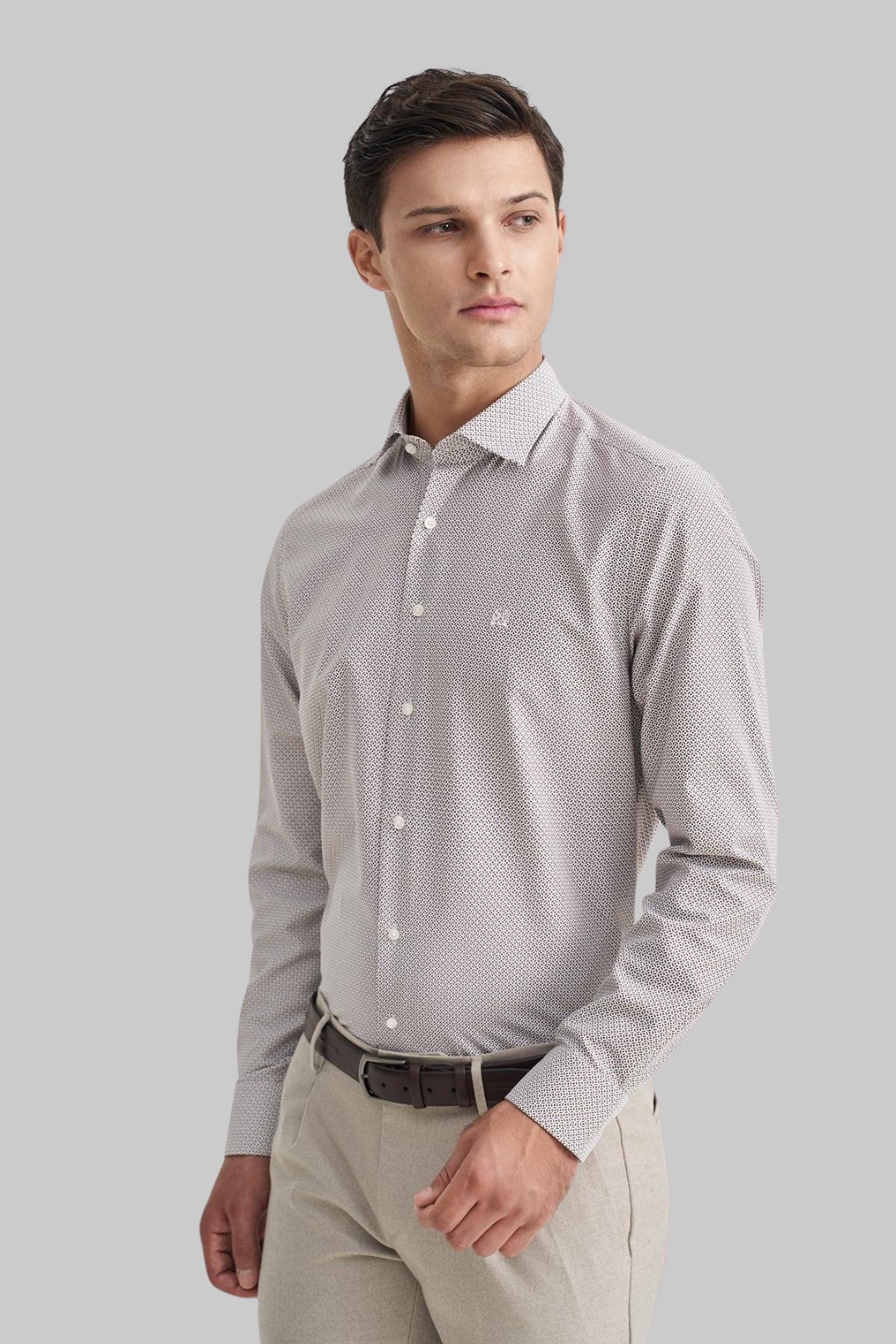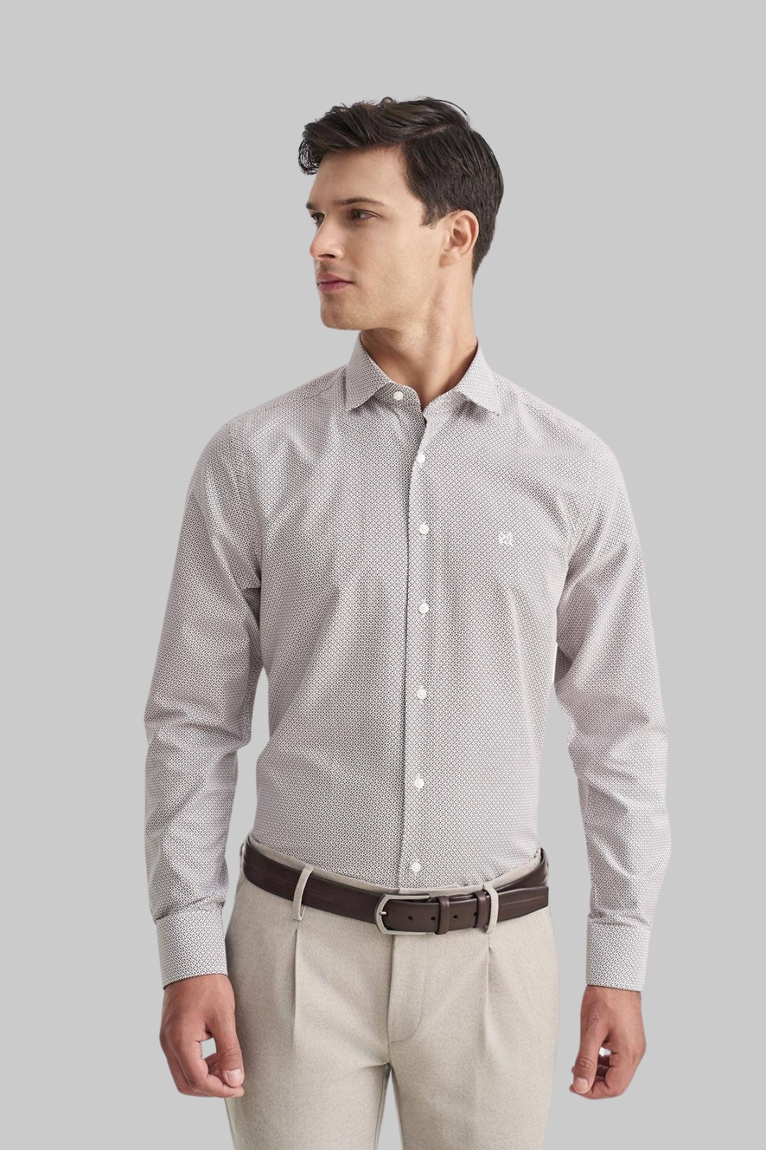 Men's all over printed white shirt with brown and blue details, from Monte Napoleone. Under the collar there are buttons to hold it in place when worn without a tie. It has the company's monogram embroidered on the right chest. Excellent quality, perfect fit and special design details, in an easy-to-wear shirt, which you can comfortably combine with chinos, jackets and other pieces from our collection, ideal for business chic, casual chic and smart casual looks.
