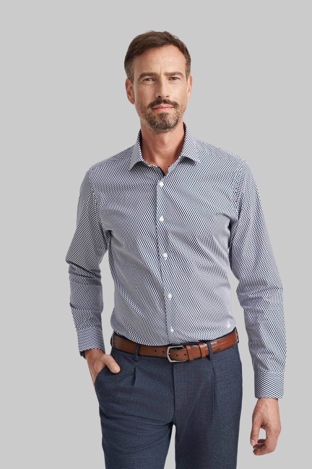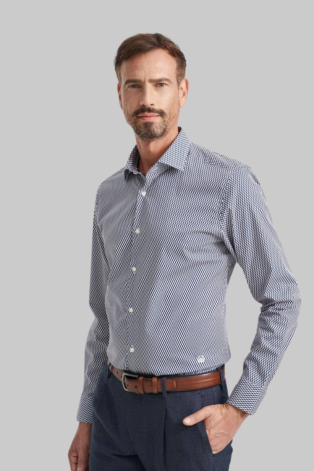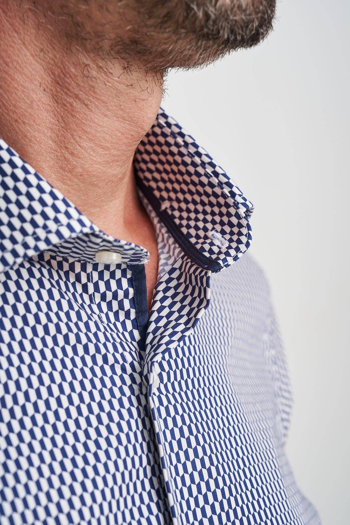 Men's shirt all over printed in white and blue, from Monte Napoleone. Under the collar there are buttons to hold it in place when worn without a tie. It has the house's monogram embroidered on the middle right. Excellent quality, perfect fit and special design details, in an easy-to-wear shirt, which you can comfortably combine with chinos, jackets and other pieces from our collection, ideal for business chic, casual chic and smart casual looks.