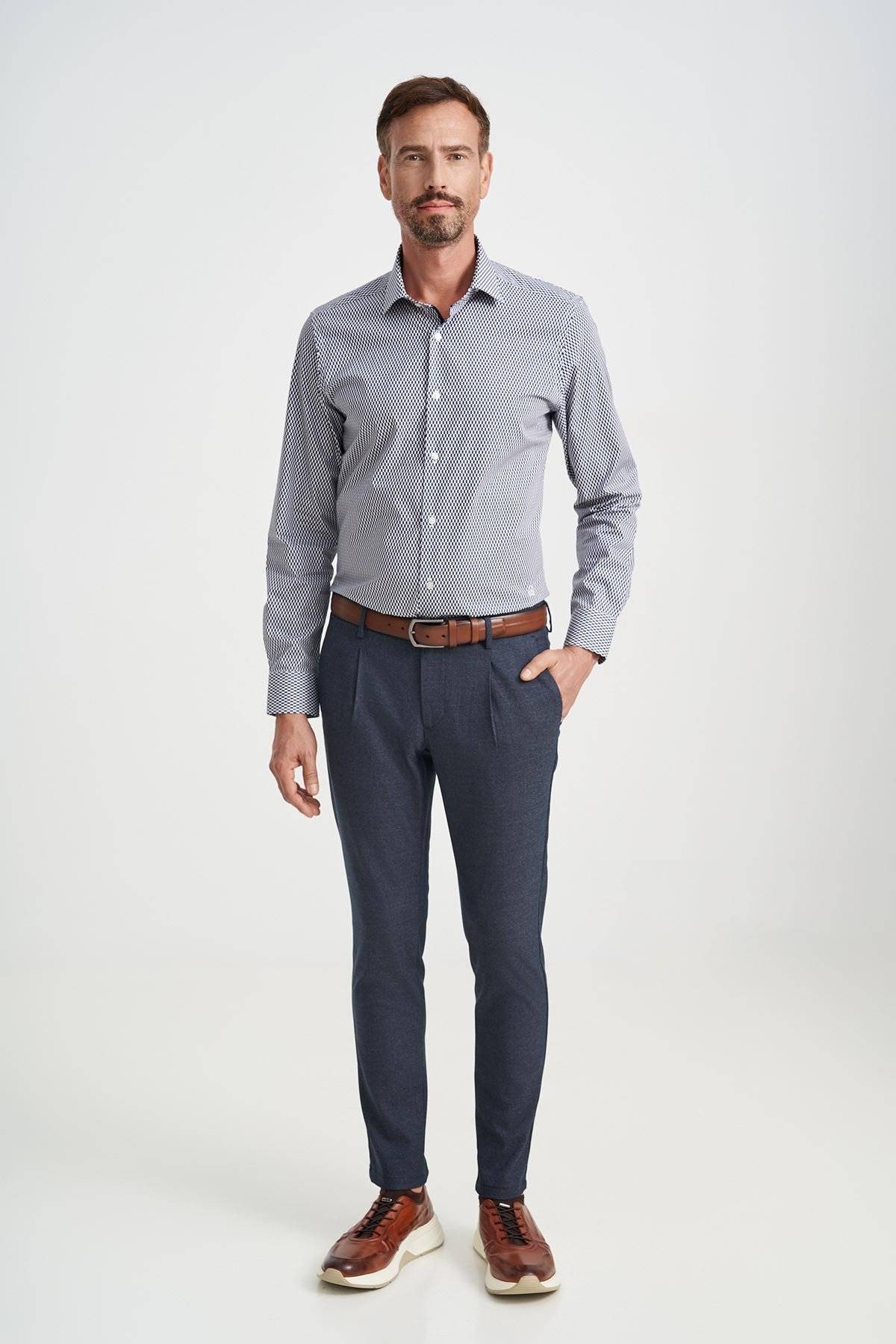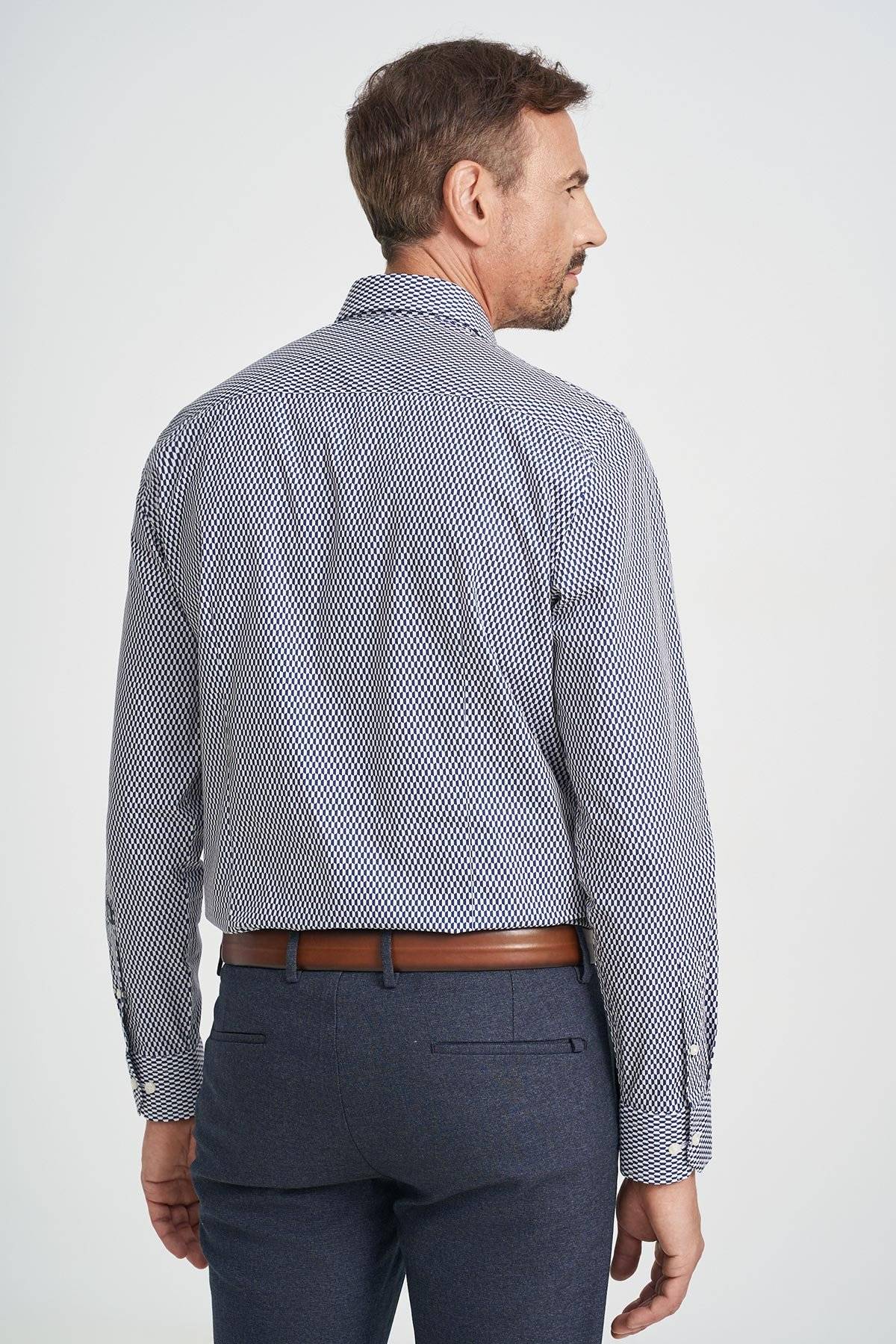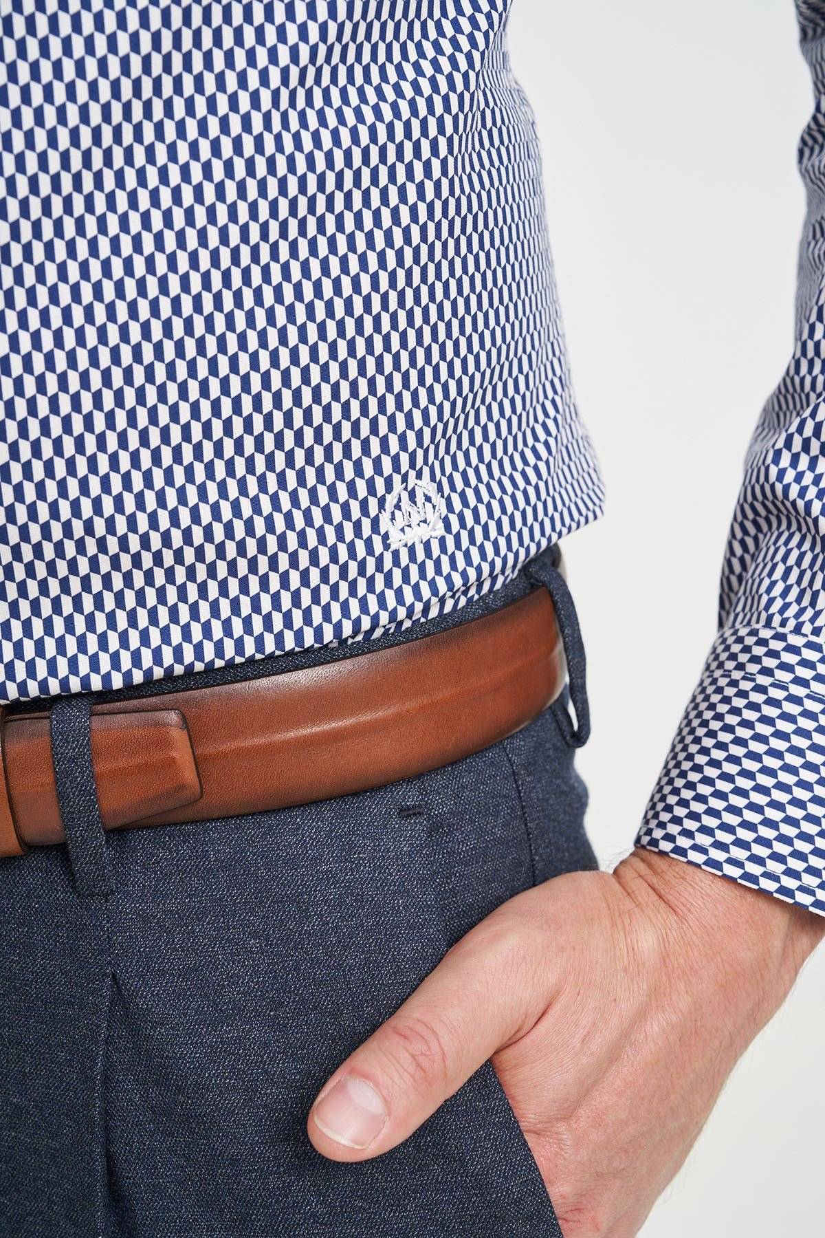 Men's shirt all over printed in white and blue, from Monte Napoleone. Under the collar there are buttons to hold it in place when worn without a tie. It has the house's monogram embroidered on the middle right. Excellent quality, perfect fit and special design details, in an easy-to-wear shirt, which you can comfortably combine with chinos, jackets and other pieces from our collection, ideal for business chic, casual chic and smart casual looks.